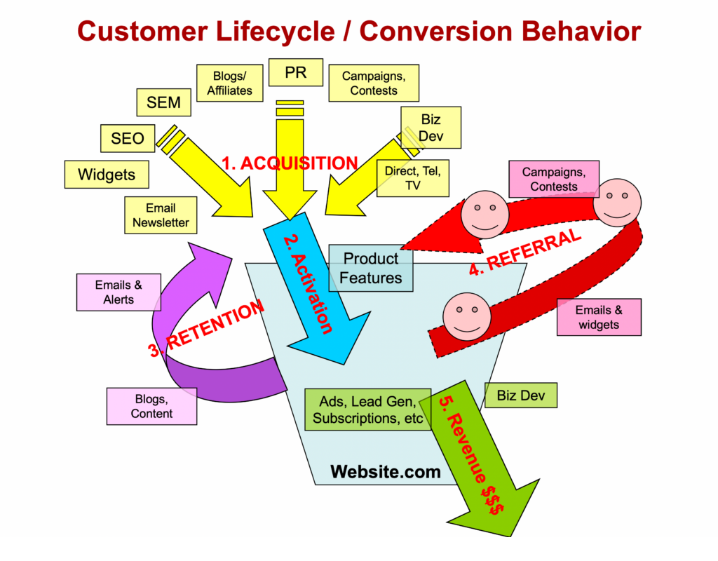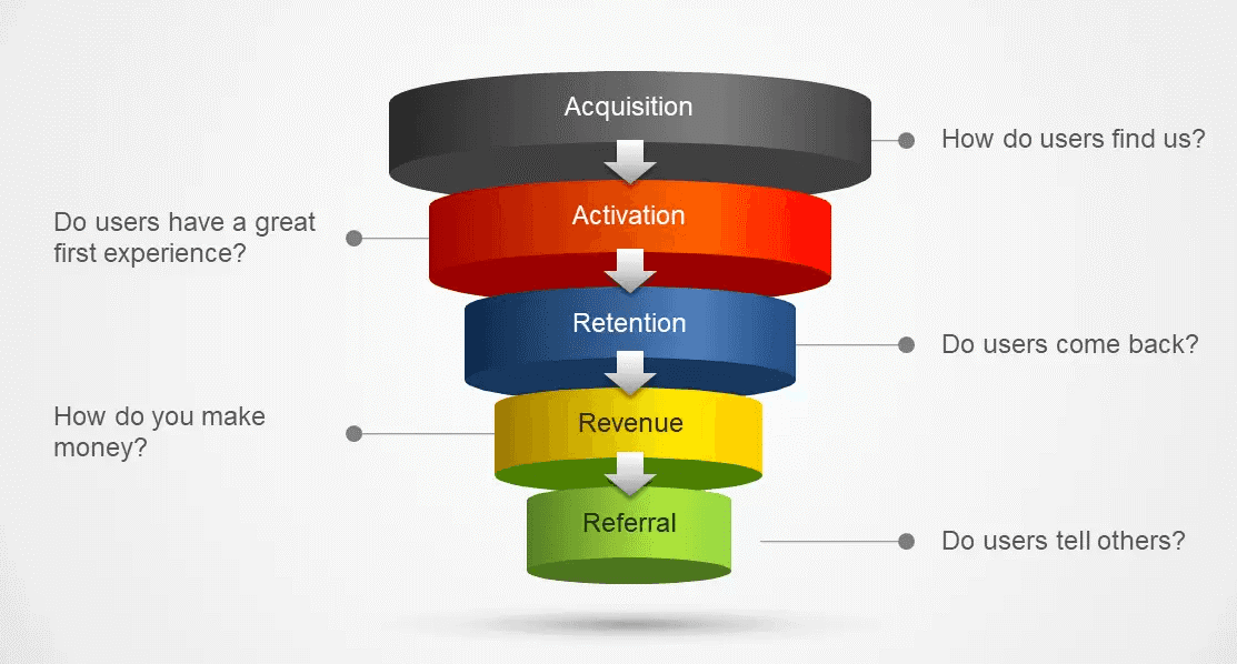 AARRR is a growth model derived from the acronym of 5 main stages in a basic customer journey including: Acquisition, Activation, Retention, Referral, and Revenue